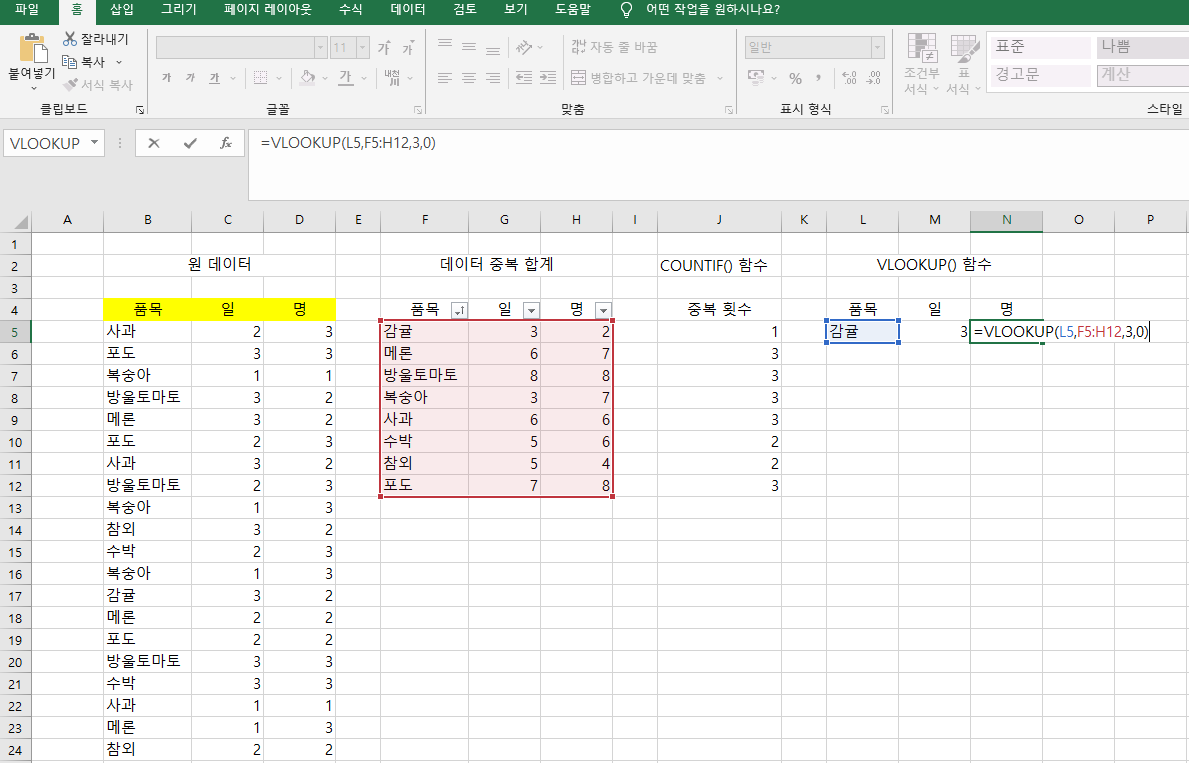 예를 들어 위에 COUNTIF사용한거에 응용하면 =COUNTIF(품목,F5) 이렇게 입력할 수 있겠죠.