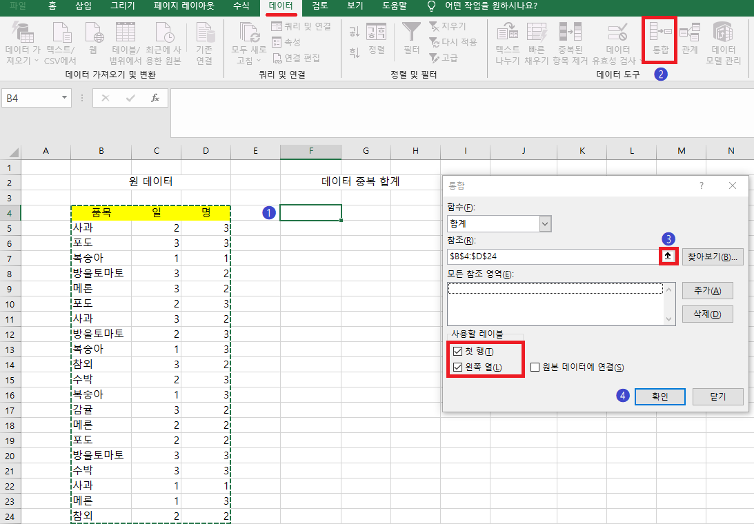 2 데이터-통합 눌러서 통합창이 뜨면 순서대로 3 버튼 눌러서 범위 드래그로 지정하고