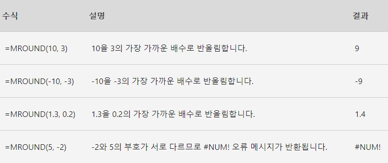 MROUND함수 = 특정 배수에 가깝에 반올림 하는 함수
